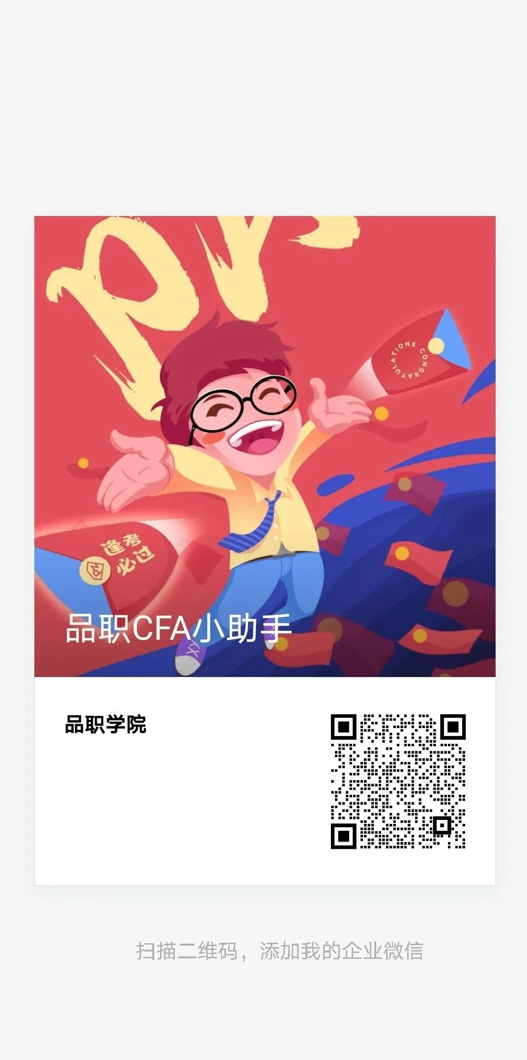 当然,复习的关键还有一个就是真正好用的复习资料,我们也为大家准备了可适用于全复习备考周期的资料,需要资料的也可以添加我们品职CFA小管家免费领,有任何关于考证相关的问题也可以咨询我们这位持证人小哥哥哦!