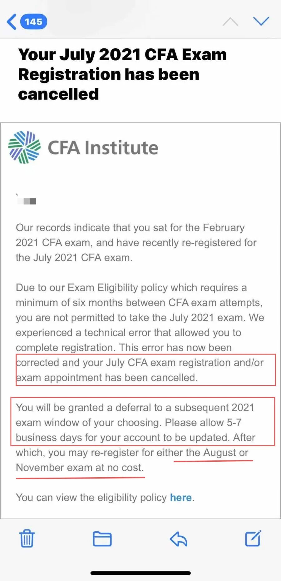 之前有一批2月刚考完考试没过又报考了7月的小伙伴,理论上协会规定2次考试之间是必须要间隔6个月的,但是重新报名的时候他们却发现7月考试竟然真的报名成功了?不过好景不长,报名成功没几天收到了协会的邮件,告知他们预约的7月考试被取消了,但是他们是可以选择defer延期到8月或者11月场次的。(之前我们也放过邮件,大家可以再看一下)