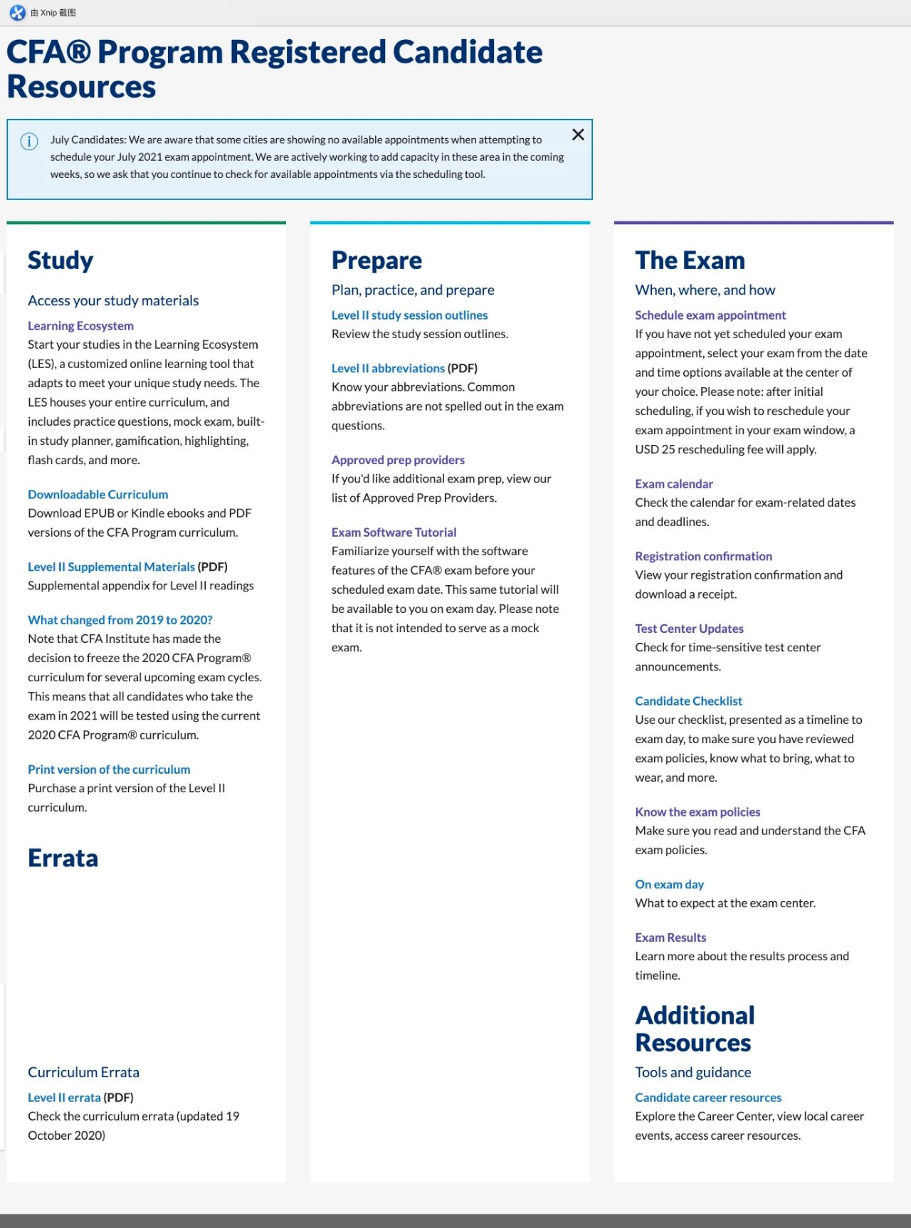 总结来说,CFA协会其实是给大家提供了很多资料的,有一部分是可以下载下来的,包括原版书Ebook、各学科占比、勘误更新、考纲变化等;还有一块资源是不可以下载,只能在线做的,包括practice exams,mock等。