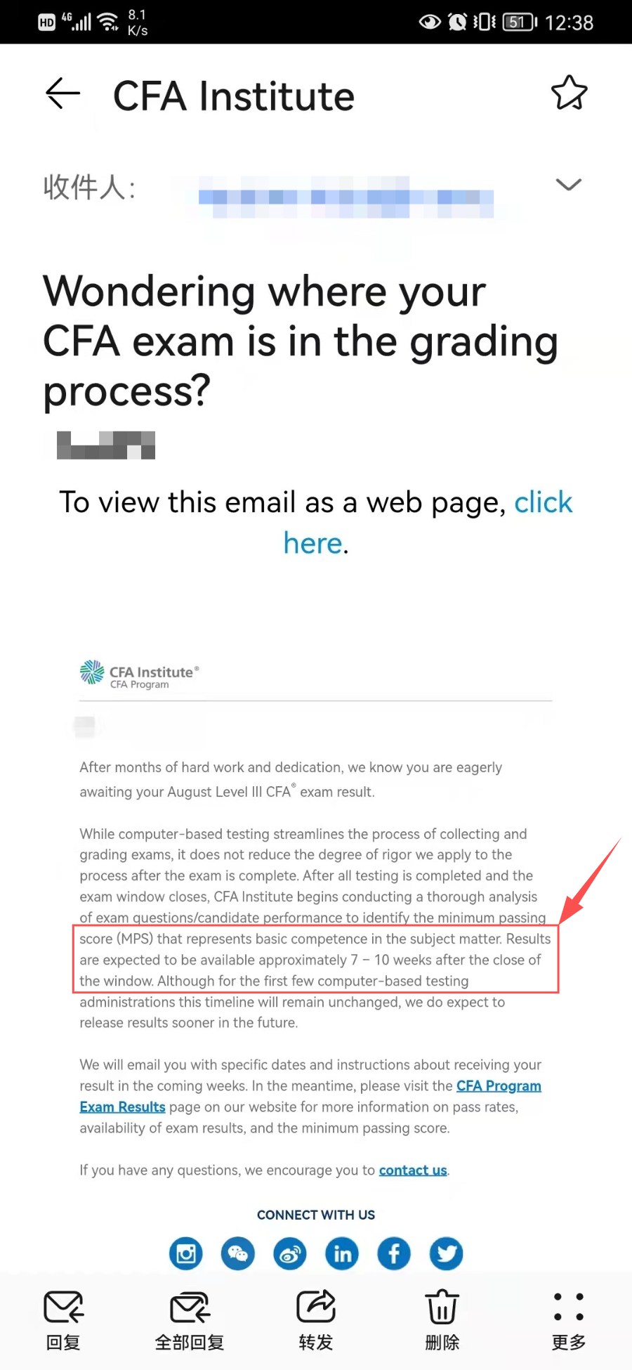 那对于放分时间,协会也给8月考生发送了邮件,从邮件内容可以看到,协会仍然会延续一贯的MPS划线标准(关于MPS线如何划定,可以看这篇文章。CFA协会再度发声:我们从来不控制通过率...),他们预计8月考期出成绩时间将在考期结束后的第7-10周左右。(具体如下图)