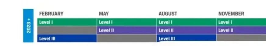 23年开始,一级一年设有4次,分别在2、5、8、11月(这个和之前没有变化);二级加开一个考期,一年有3次考期机会,分别在5、8、11月;三级一年有2次考期机会,在2月和8月。