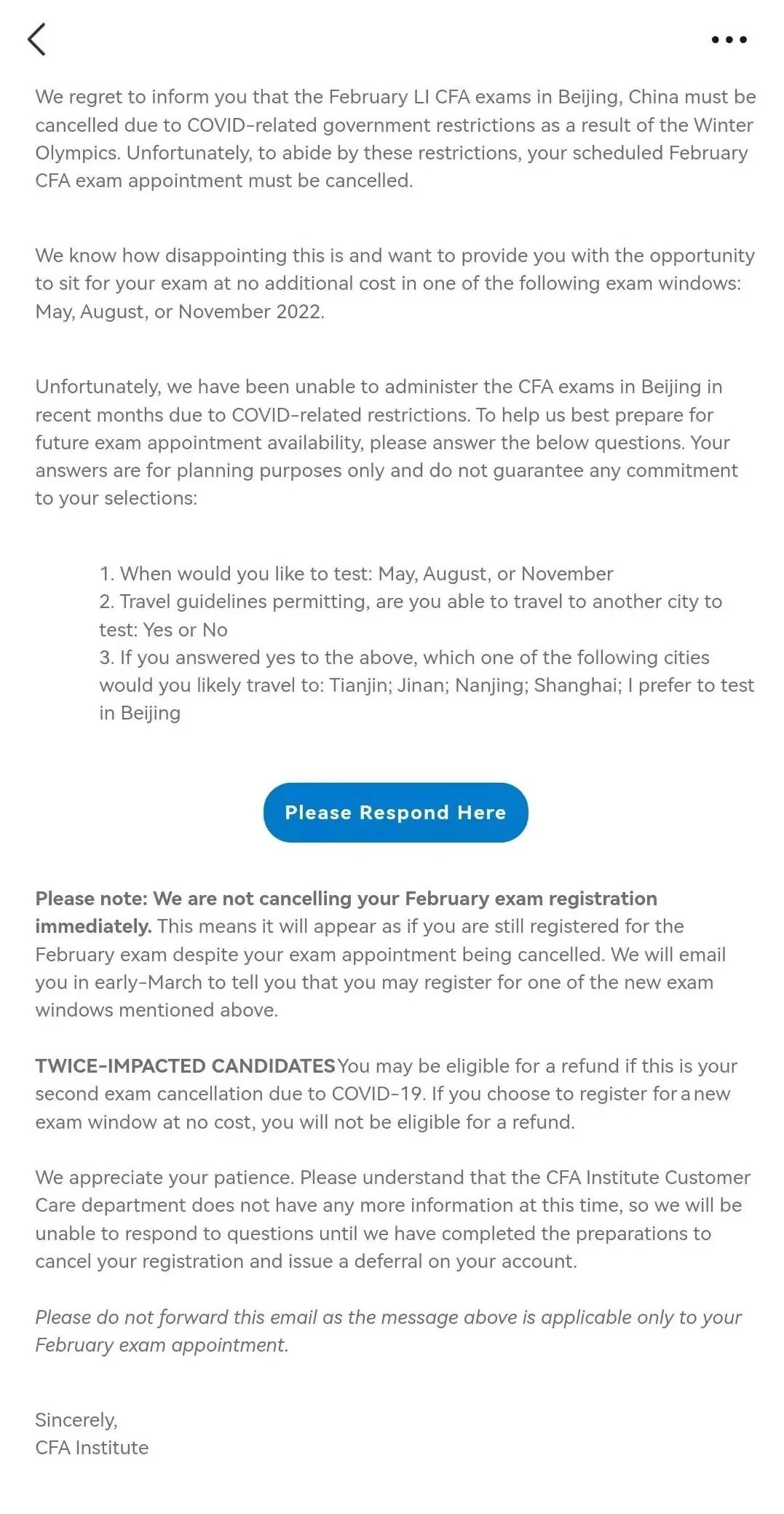昨天我们还说,2月考期目前没有大规模的取消,看来是稳了,谁知道就在今早,CFA小伙伴们就收到了邮件:官宣2月北京一级考试取消,那取消了需要做些什么,我们会在下文详解。