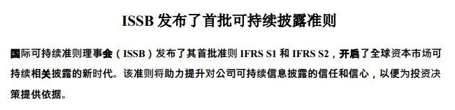 这是有史以来的首套全球ESG报告标准,为各地区的公司披露统一的气候和可持续性信息铺平了道路,进一步提高了各国公司之间的可比性,此举堪称ESG领域的里程碑事件。