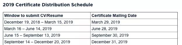 根据邮件中的描述,协会每年会分四次寄送证书,一般是在3月、6月、9月、12月。今年的时间表可以看一下,如果是在9月13前提交CV,证书会在9月30日统一寄送出来。