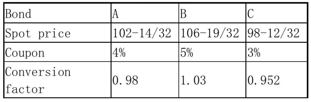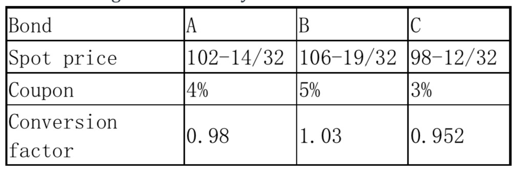 The cost of delivering each bond is the price divided by the conversion factor. This gives, respectively,(102+14/32)/0.98 = 104.53, 103.49, and 103.34. Hence the CTD is bond C. Allother information is superfluous.