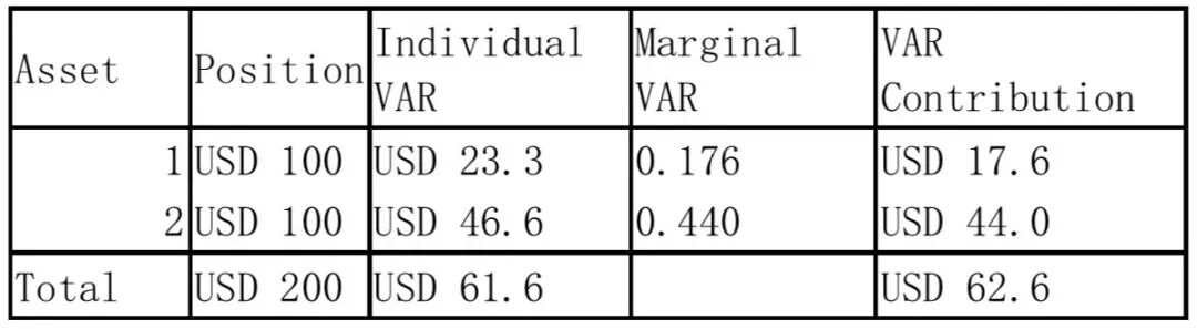 拿走之前组合的VAR是61.6,拿走之后组合的VAR就等于资产1的VAR等于23.3,两者作差得到reduction。这并没有用到“两个individual VAR之和等于组合的VAR”