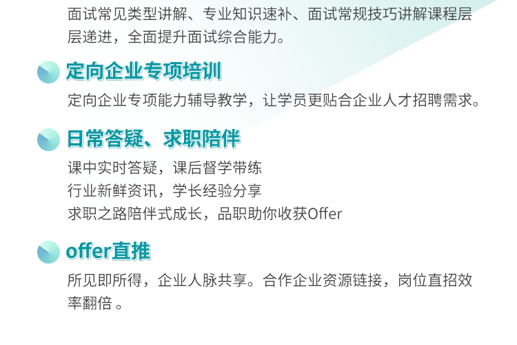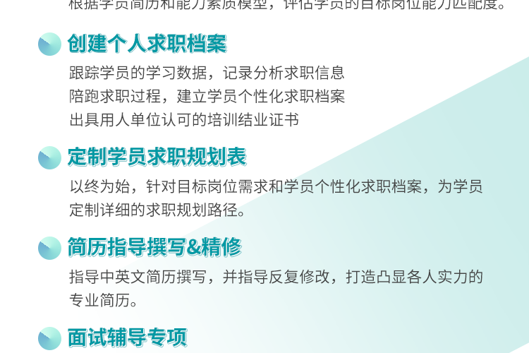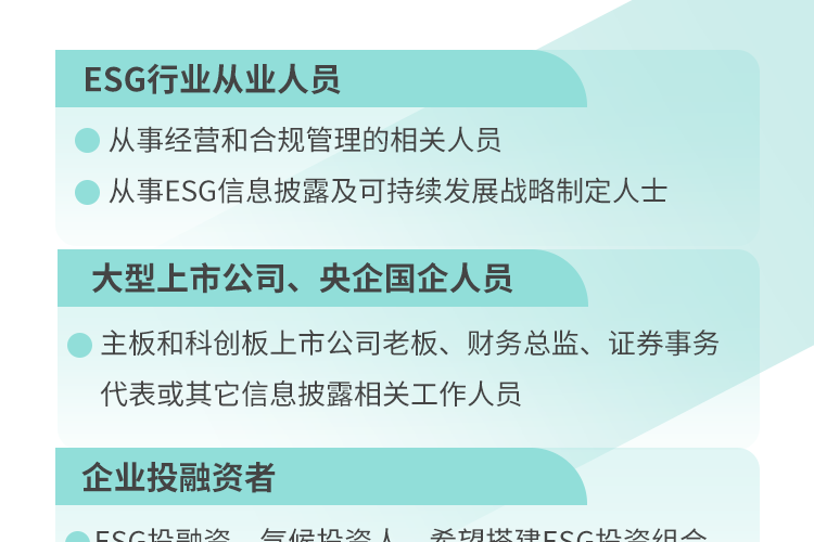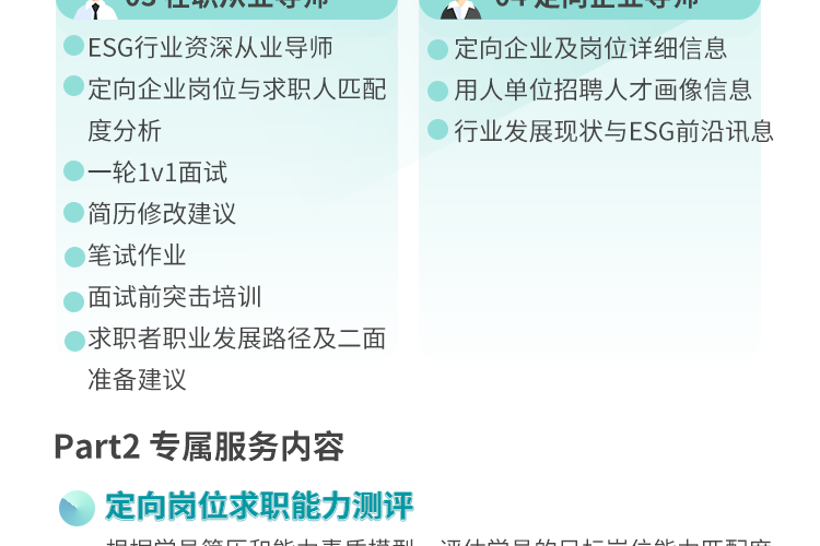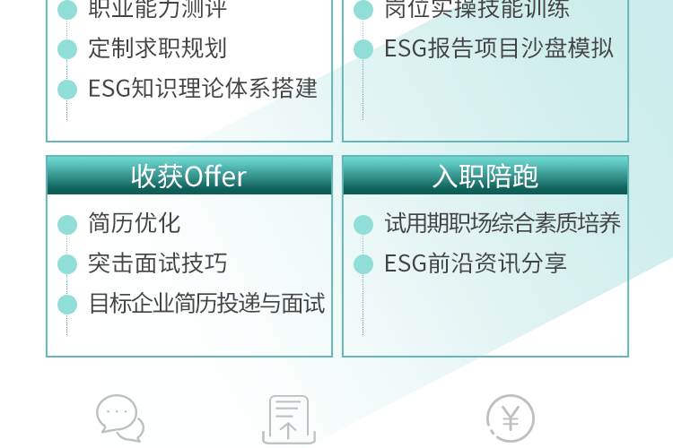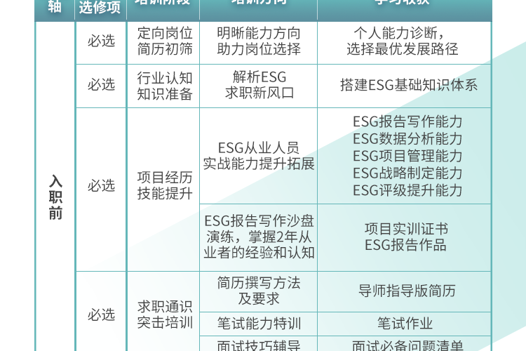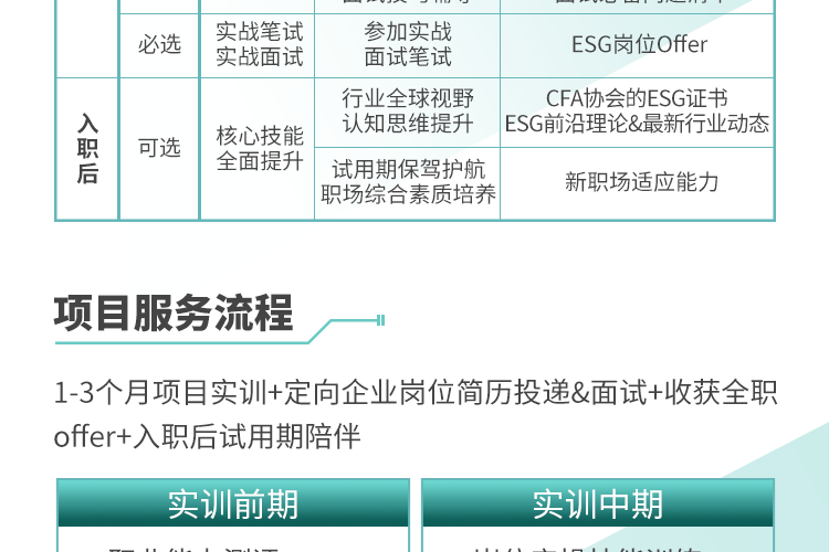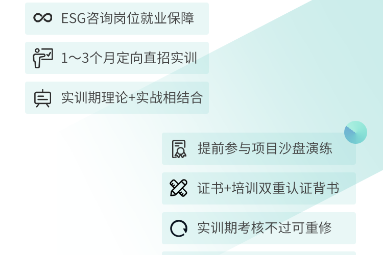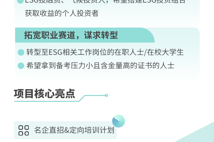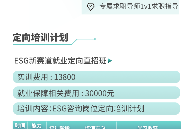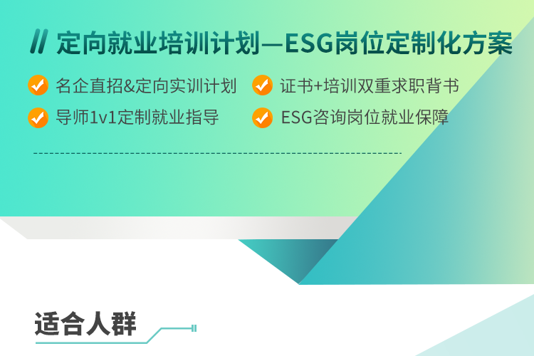 定向就业培训计划——ESG岗位定制化方案 一:名企直招&定向实训计划 二:证书+培训双重求职背书 三:导师1v1定制就业指导 四:ESG咨询岗位就业保障